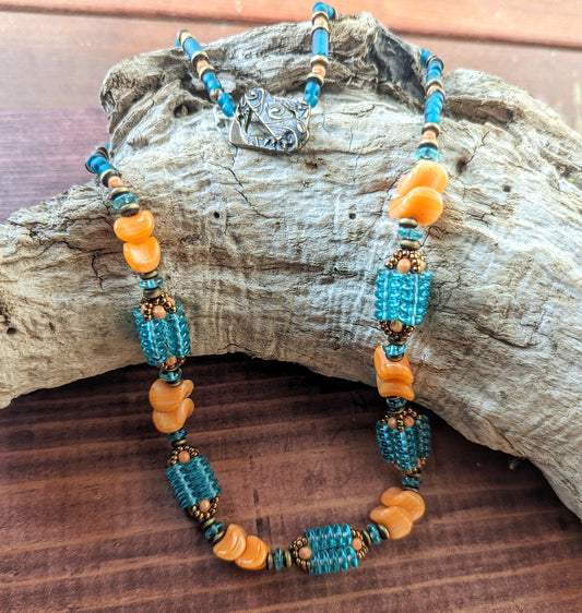 Blue Opal, Payapa and Gold Woven Bead Necklace